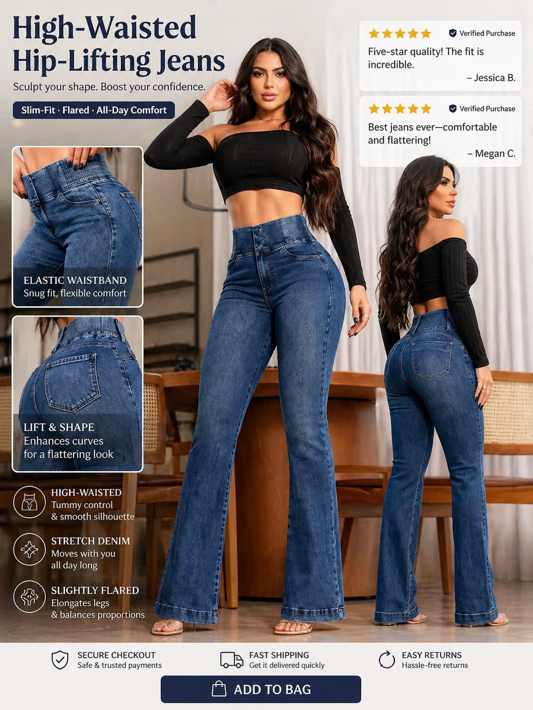 These high-waisted flared jeans are designed to hug your body in all the right places — smoothing your waist, lifting your shape, and giving you that confident, effortless look.